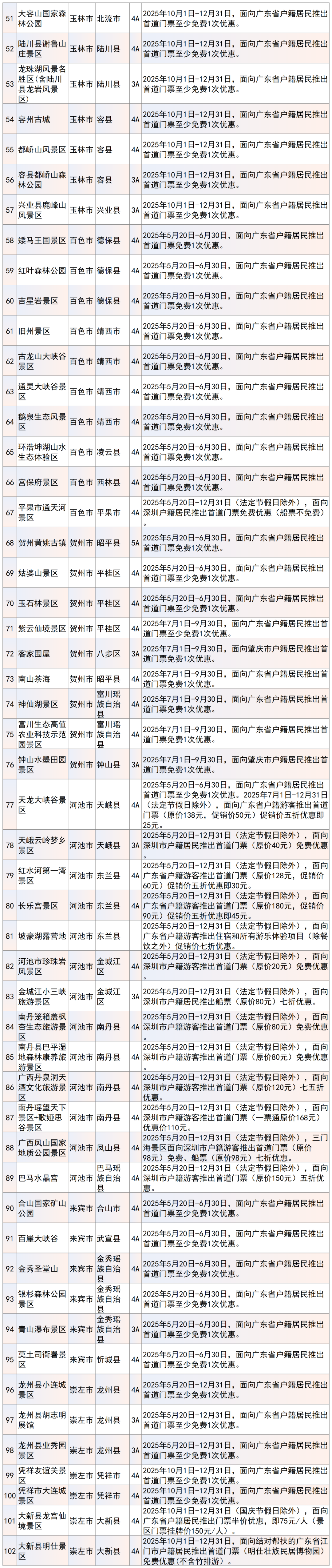 近年来,广东省开展了多层次、多形式、宽领域、全方位帮扶协作,为感谢广东的真情帮扶,自2025年5月20日起,广西102家景区面向广东省户籍居民推出门票优惠活动,景区涵盖广西全部地级市,包括4家5A级、72家4A级国家旅游景区,免首道门票的景区90家、首道门票和旅游项目打折的景区12家。