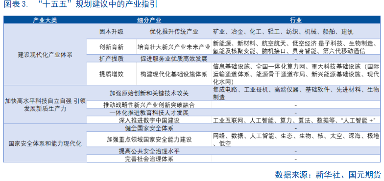 “十五五”建议稿针对多个方面提供了具体的产业指引。首先,《建议》对产业发展的思路顺序进行了明确,部署了包括固本升级、创新育新、扩容提质、强基增效四方面的具体任务,其中值得注意的是,在最新表述中,将传统产业单独拎出于新兴和未来产业并列描述,传统产业的优化改造优先于发展新兴产业,体现了在“以经济建设为中心”的过程中,培育创新引擎的同事也必须同步夯实传统产业的跟机,传统产业是保障国民经济的 “基本盘”。这一表态也符合此前发改委在发布会上强调的传统产业是当前我国产业体系的基本盘的描述。