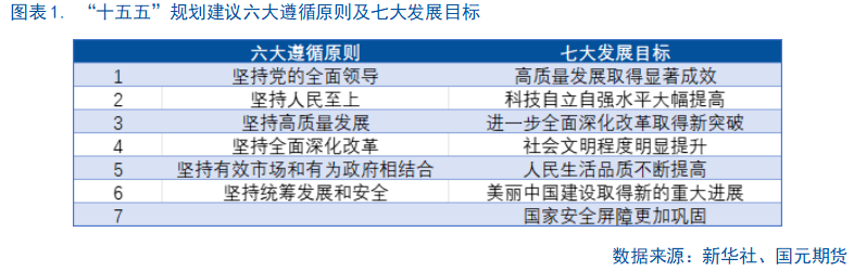 对比“十四五”与“十五五”的规划建议,“十五五”规划六大遵循原则和七大发展目标。六大遵循原则中,十四五的“新发展理念”进一步明确为“高质量发展”,因地制宜发展新质生产力,畅通国内国际双循环的核心经济发展理念进一步明确。“坚持深化改革开放”转变为“坚持全面深化改革”,“坚持系统观念”转变为“坚持有效市场和有为政府相结合”与“坚持统筹发展安全”,进一步确认在当前的百年未有之大变局下,需要以新安全格局保障新发展格局,在发展过程中充分发挥市场在资源配置中的决定性作用。整体来看,所有配套制度围绕“新质生产力+两个大循环”这一核心展开,形成兼顾发展和安全的新经济格局。七大发展目标较“十四五”规划建议增加一项,将“经济发展取得新成效”拆分为“高质量发展取得显著成效”和“科技自立自强水平大幅提高”两项,在外部形势急剧变化的当前,更加强调发展的质量、科技自立自强水平、内需尤其是消费的重要作用、国际影响力和软实力的提高。