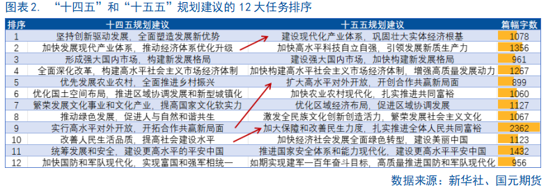 对比“十四五”与“十五五”规划建议中提到的重点工作,部分工作重点的顺序出现调整,建设现代化产业体系(产业)被升至第一位,科技自立自强(创新)则降至第二位,表明未来五年将开始强调由创新成果向强大的制造业生产力的转化。推进高水平对外开放(开放)的重要性得到大幅提升,从第九位升至第五位,表明在当前海外贸易环境动荡的大背景下,为应对海外脱钩断链等不确定性,服务业(比如电信、金融、医疗、教育)的开放开始受到重视,吸引国际资本入内。加大保障和改善民生力度的重要性也有所提高乐众盈,且占据最大篇幅,表明内需和消费主导的发展模式可能得到进一步明确。